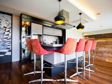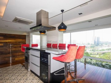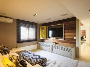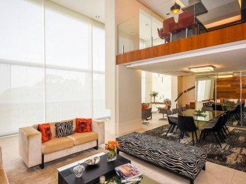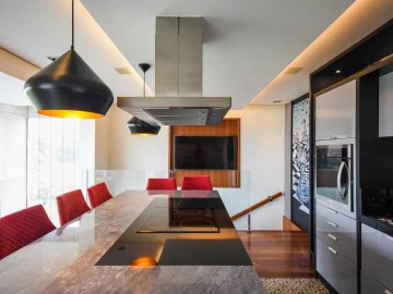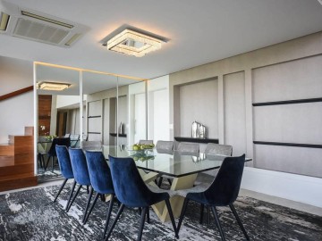 Living ampliado e nivelado, perfeita com 4 ambientes (sala de estar com parede total em madeira maciça, sala de jantar para 10 lugares, sala de estar com bar, ao subir o mezanino pela escada em madeira iluminada, temos a cozinha gourmet equipada de ilha e coifa central em granito, muito agradável receber familiares e amigos.