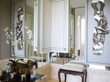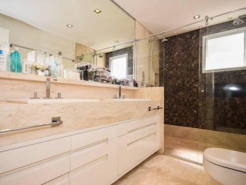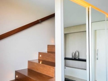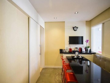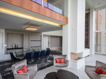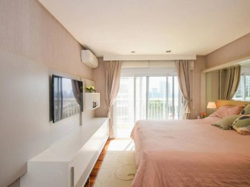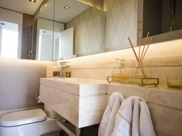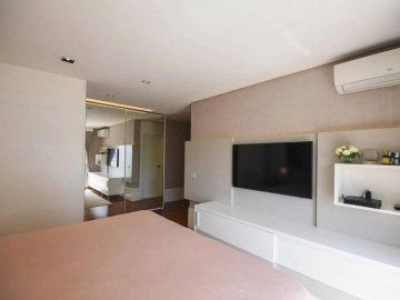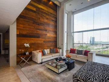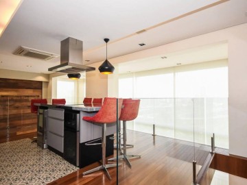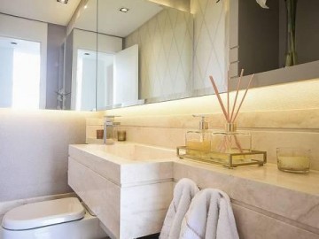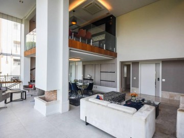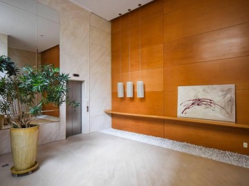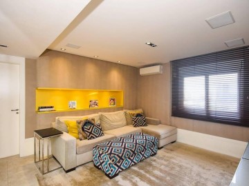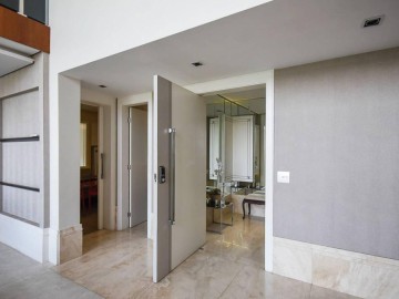 Elevador e hall privativo, com porta pivotante e fechadura smart lock, lavabo decorado, teto em sanca de gesso com iluminação em Led + lustres, ar condicionado Cassete no living e climatização em todos os ambientes.