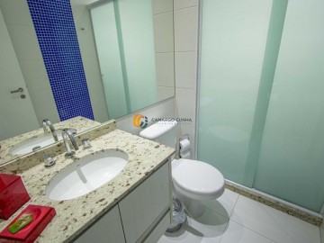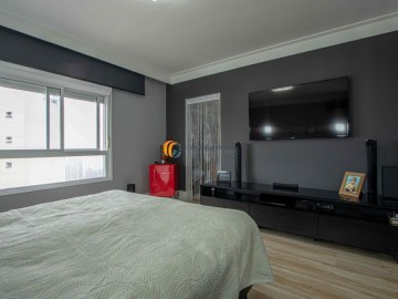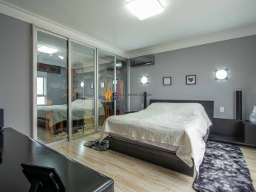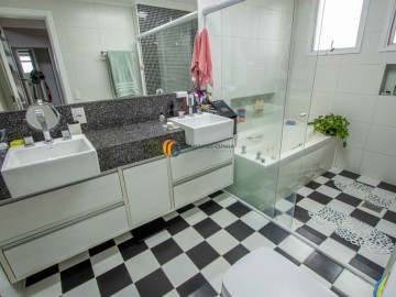 Suíte master com ar condicionado, dois closets, dois chuveiros, banheira com hidro, duas cubas e tv.