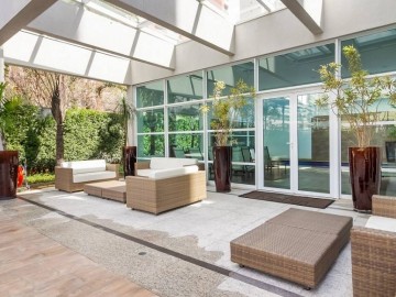 Possui um lindo terraço gourmet totalmente envidraçado com churrasqueira, mesa para 06 pessoas e lareira com 02 chaises.