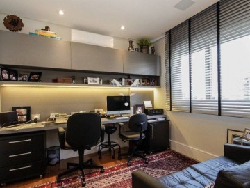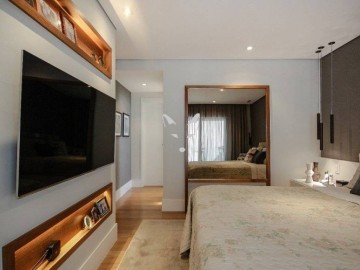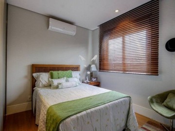 -Suíte master com 3 closets com marcenaria de alta qualidade, iluminação e sensor de presença, espelhos bronze; varanda envidraçada (Mansur) e persianas