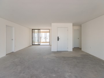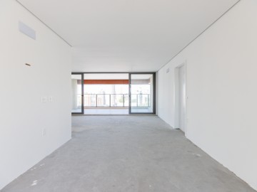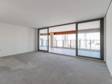 Vigas mais altas entre a sala e as 2 varandas - social e gourmet - integração total. Terraços nivelados