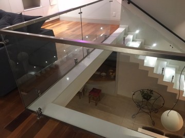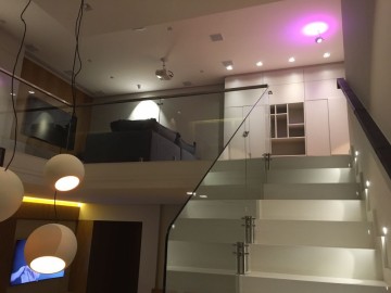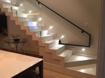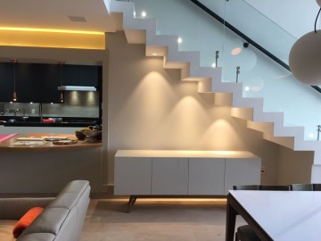 - Escada para o mezanino em pedra branca quartzo, corrimão revestido em couro e design exclusivo.