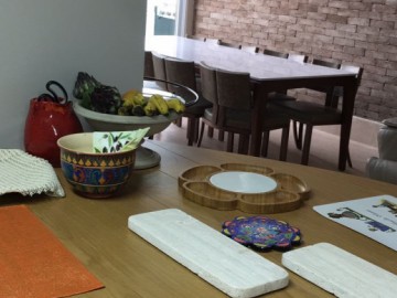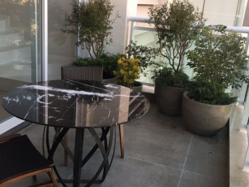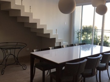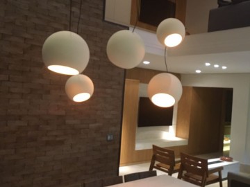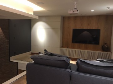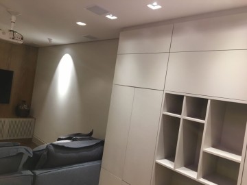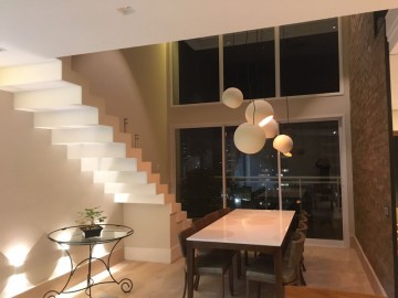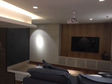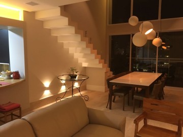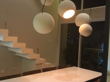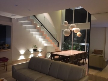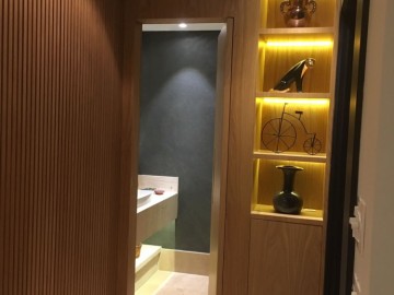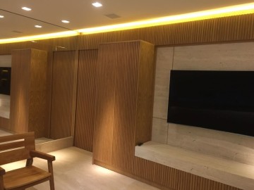 Todo o piso da sala, sala de jantar, lavabo e hall de elevador possui o piso em pedra natural, Travertino Toda a marcenaria é em Laca e Carvalho americano.