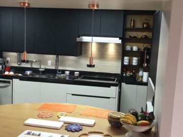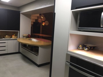 - Cozinha aberta tipo americana, com mesa balcão em carvalho americano e marcenaria em laca gofratto