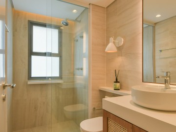 O apartamento é mobiliado e possui um elegante espaço gourmet com churrasqueira. A cozinha integrada é moderna e funcional, equipada com móveis planejados e gás encanado. O living com sacada proporciona uma vista agradável e traz luz natural para os ambientes, enquanto o lavabo e a área de serviço garantem praticidade para o dia a dia.
