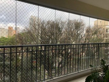 Varanda com fechamento em lâminas de blindex, e rede de proteção