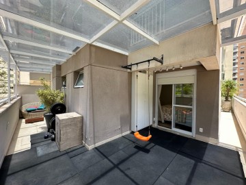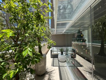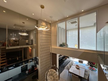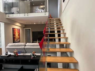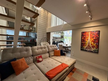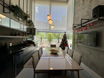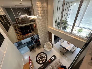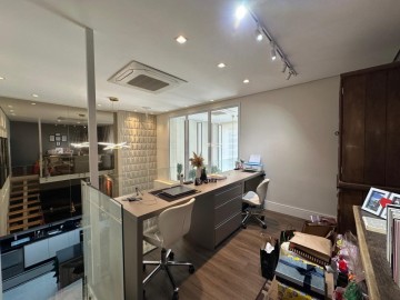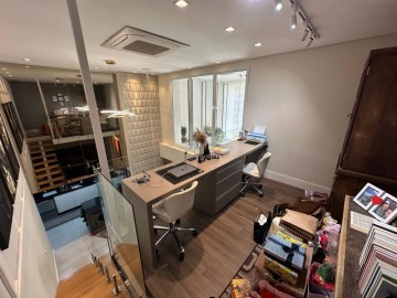 Pé direito duplo, escritório no mezanino, 3 suítes, lavabo social, hall privativo, depósito, duas vagas fixas. Apartamento Garden, localizado no primeiro andar, equivalente ao quinto andar comparado prédio da frente. Comprado na planta, feito com engenheiro e arquiteto, com móveis planejados em todos os cômodos, ar condicionado em todos os ambientes, com K7 na sala e terraço, coifas sob medida, eletrodomésticos embutidos, churrasqueira a gás.