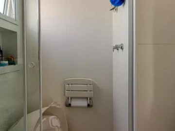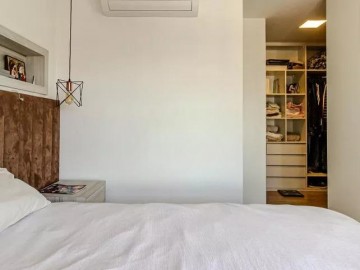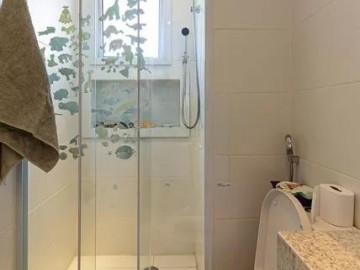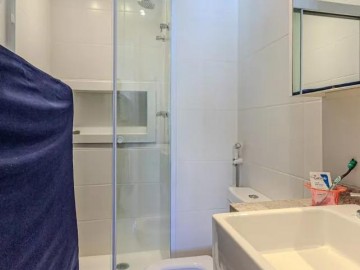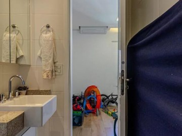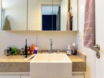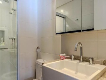 O imóvel com varanda, lavabo, armários nos banheiros, closet, armários na cozinha, cozinha americana, ar condicionado, chuveiro a gás e área de serviço.