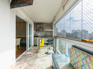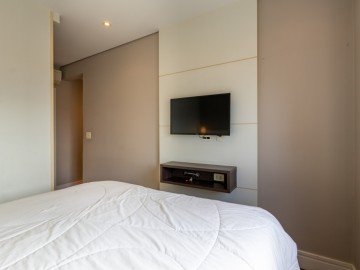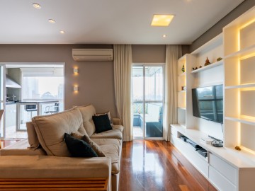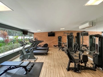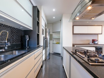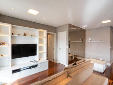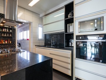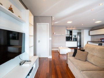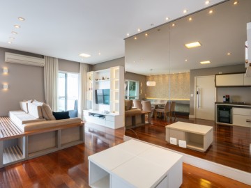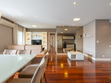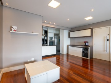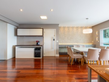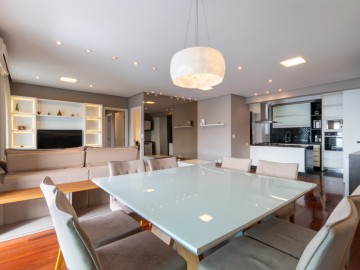 A cozinha integrada à sala cria um ambiente moderno, elegante e acolhedor, perfeito para receber amigos e familiares. O apartamento possui móveis planejados de alta qualidade, além de piso de madeira, garantindo charme, requinte e praticidade na rotina. A ampla sacada proporciona uma vista panorâmica deslumbrante da cidade, ideal para contemplar o amanhecer ou relaxar ao fim do dia.