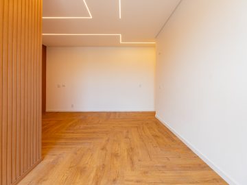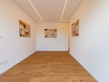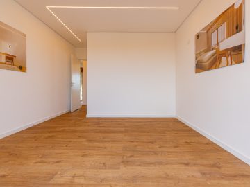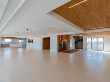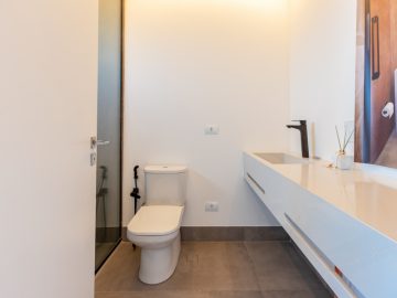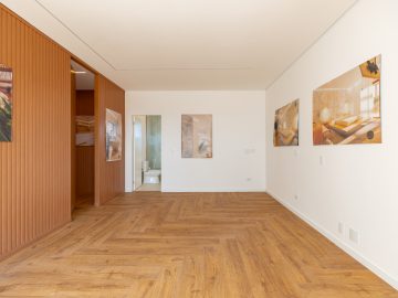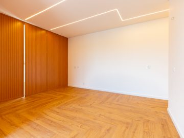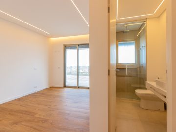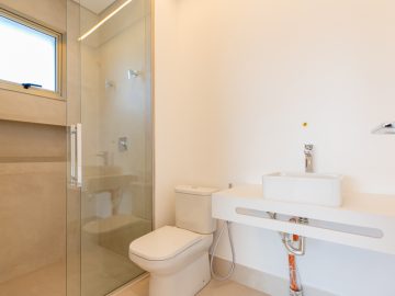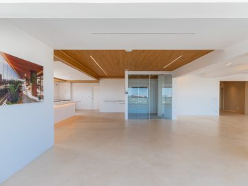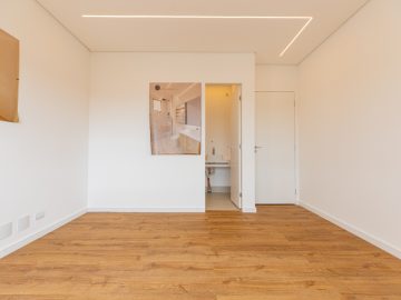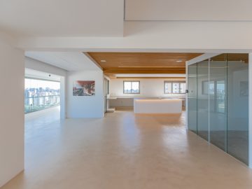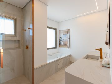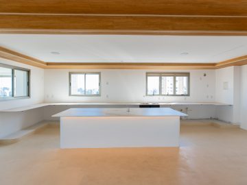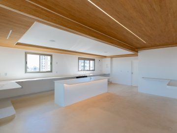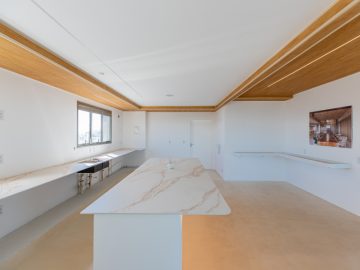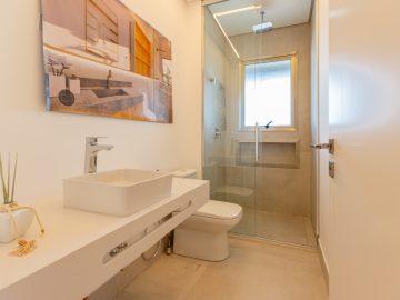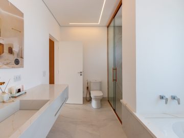 Já na parte de cima, temos a área íntima com um longo corredor que liga as 5 suítes. A principal delas conta com um closet walk in grande e banheiro senhor e senhora. Neste mesmo corredor temos ainda um espaço para uma pequena cozinha. 4 das 5 suítes são ligadas a uma enorme varanda.