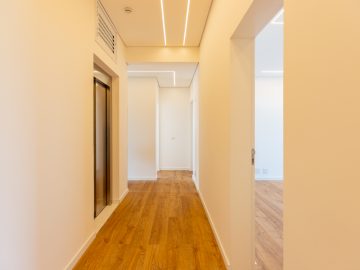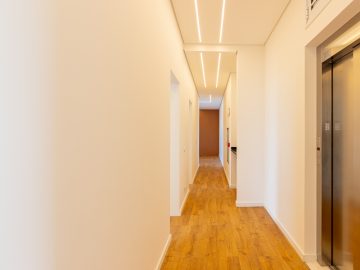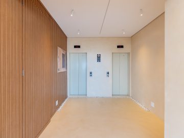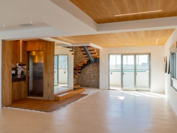Além dos dois elevadores privativos do hall, esta cobertura apresenta um elevador separado ao lado da escada para a parte de cima, onde se encontra a área íntima.