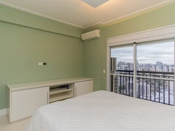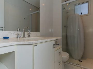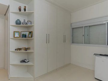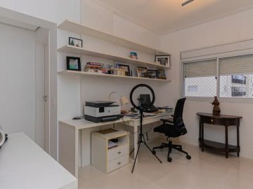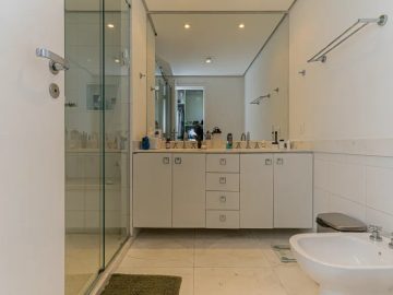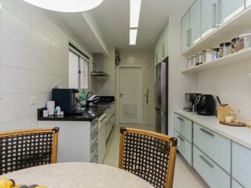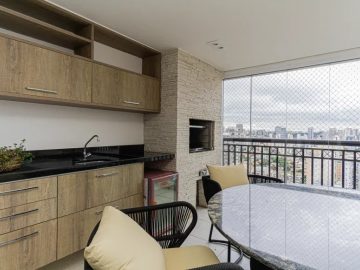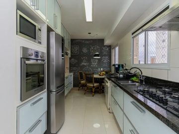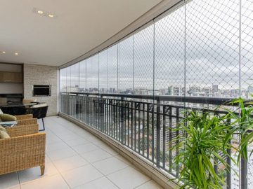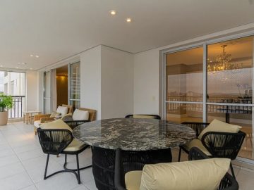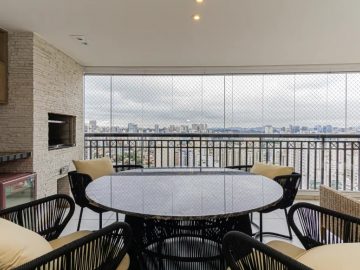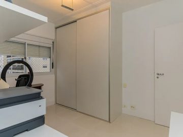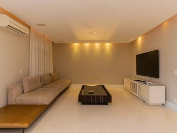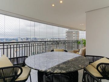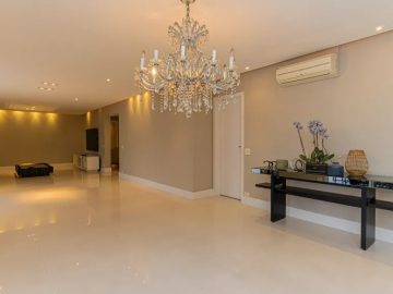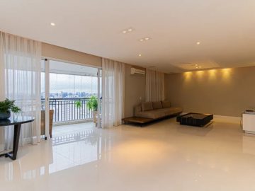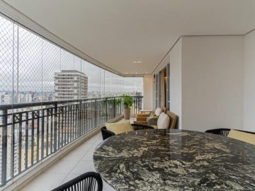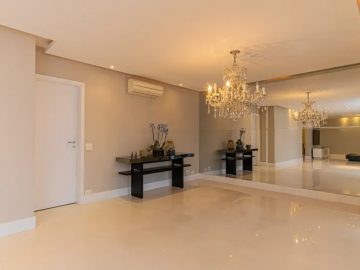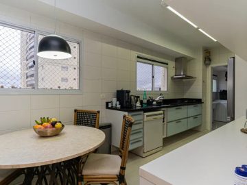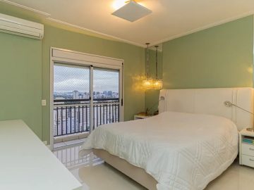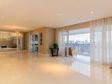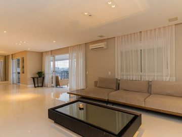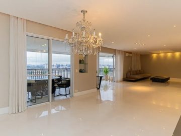 Apartamento com 229m² em andar alto, com vista livre, 4 suítes (sendo a master com closet e varanda), ar condicionado, amplo living para 3 ambientes, varanda gourmet com fechamento em vidro, lavabo, cozinha com copa, área de serviço, dependência completa de serviço, imóvel repleto de armários, 4 vagas de garagem e depósito privativo.
