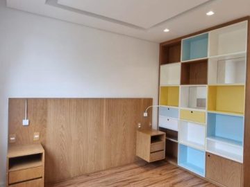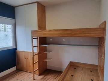 Piso porcelanato nas áreas sociais, piso laminado nos dormitórios.