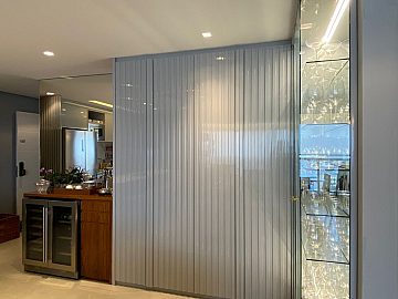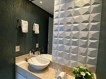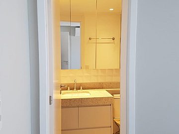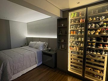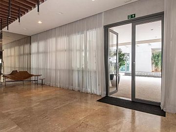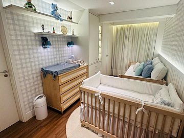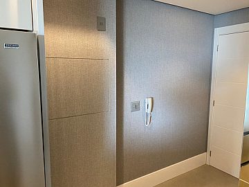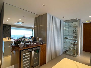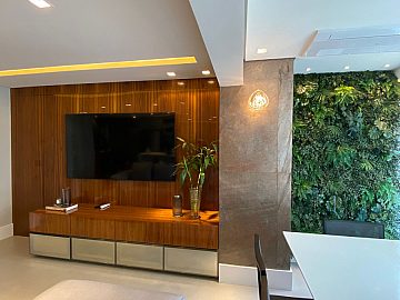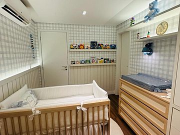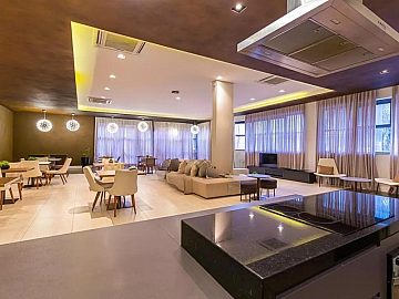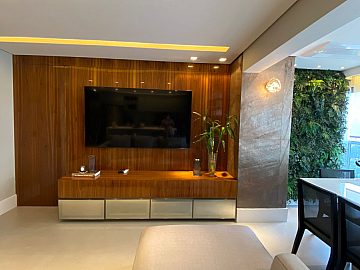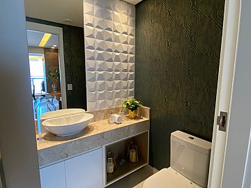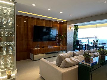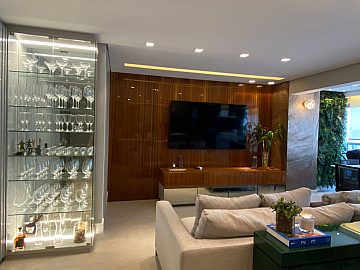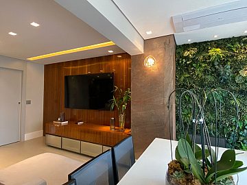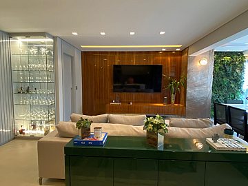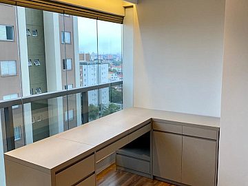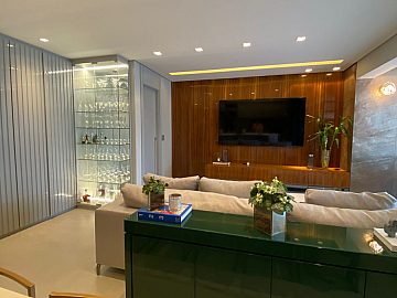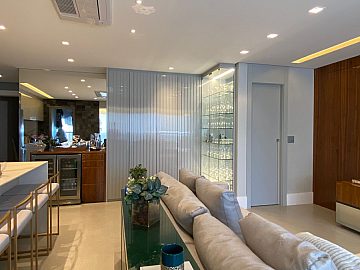 Apartamento com 2 suítes, sendo a suíte master com closet e escritório, cozinha gourmet (americana), varanda integrada ao living (sala de jantar e estar), com ar-condicionado cassete com fechamento em vidro e churrasqueira elétrica.