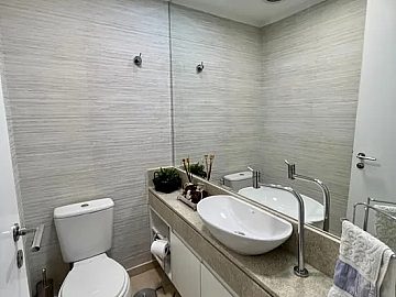 Diferenciais: Armários planejados e ar condicionado em todos os ambientes, banheiros das suítes com ventilação natural, suítes espaçosas, lavabo, cozinha americana com ilha, entrada social e de serviço, sala com 2 ambientes, varanda grande e envidraçada, vista livre, sala integrada com a varanda, lavanderia grande, terraço técnico para as condensadoras do ar condicionado, banheiro de serviço, e muito mais...