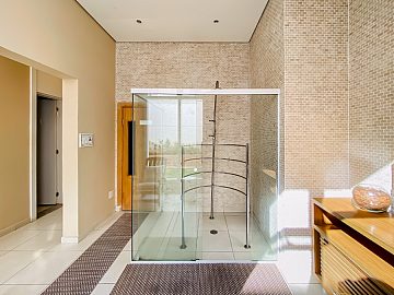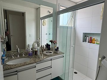 Banheiros com decoração moderna, Box de vidro tipo Blindex , gabinetes e espelhos.