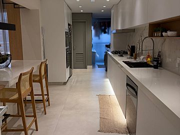 Apartamento com área de 138 m², 3 dormitórios (sendo 3 suítes), 4 banheiros + lavabo e 2 vagas de garagem + depósito.