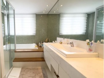 A planta original, com 4 suítes, foi inteligentemente transformada, priorizando o conforto e o luxo. Agora, você conta com um closet incrível em uma das suítes, trazendo ainda mais espaço para suas necessidades. A suíte master, por sua vez, é um verdadeiro refúgio: equipada com uma cama king size, ela oferece um master closet espaçoso e um banheiro de tirar o fôlego, com banheira separada da cabine de banho. A modernidade e sofisticação dos banheiros, todos reformados, são um destaque à parte.