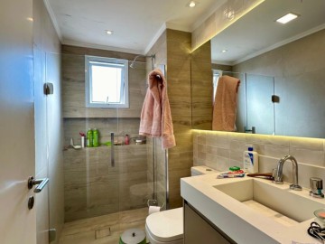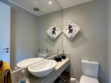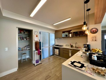 Piso em porcelanato Portobello, conferindo sofisticação e durabilidade. A sala espaçosa se integra harmoniosamente à varanda gourmet, proporcionando um ambiente amplo e iluminado por luz natural, cozinha aberta e moderna, área de serviço arejada.