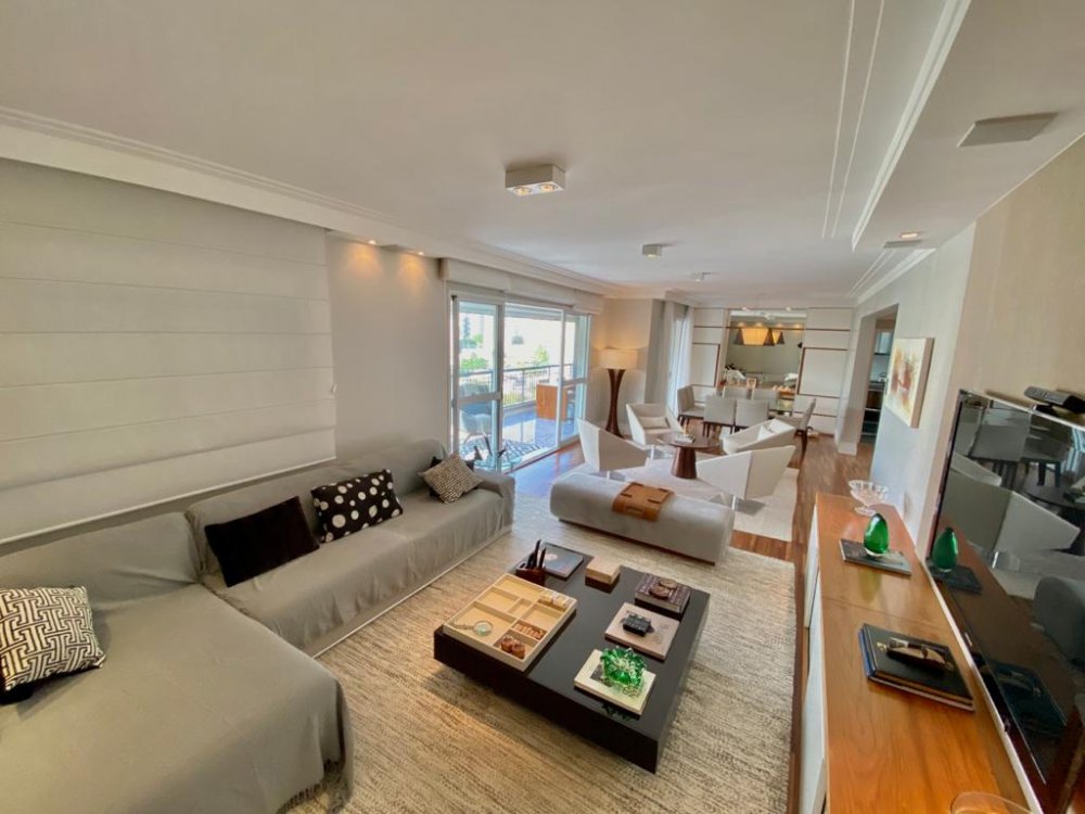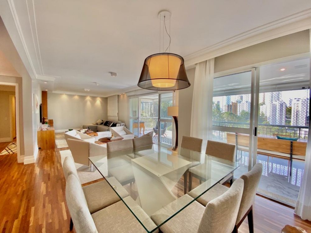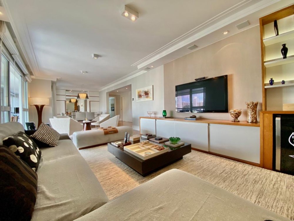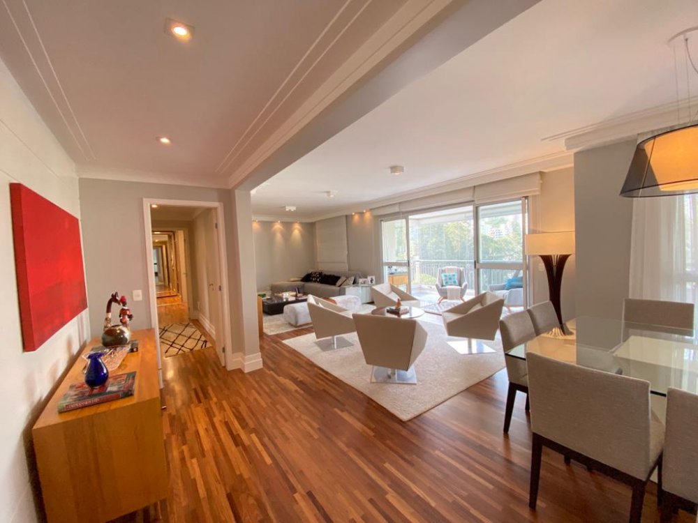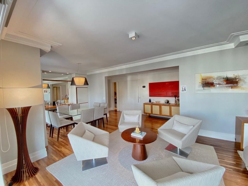 Apartamento com 195m², planta original de 4 dormitórios(porém foi alterada pra 3 suítes, ficando uma sala enorme pra 3 ambientes, podendo reverter pra 4 dormitórios), varanda gourmet em L integrada à cozinha e living e 4 vagas de garagem. O imóvel está impecável, com piso de madeira em toda sala e dormitórios, piso de porcelano líquido na varanda, cozinha e área de serviço. Muito bem cuidado, o mesmo é repleto de armários e ótima iluminação. Todos os banheiros com ventilação natural. Rico em sol(pega sol o dia inteiro) e uma vista incrível no terraço. Próximo aos Shoppings Jardim Sul e Mourmbi Town..